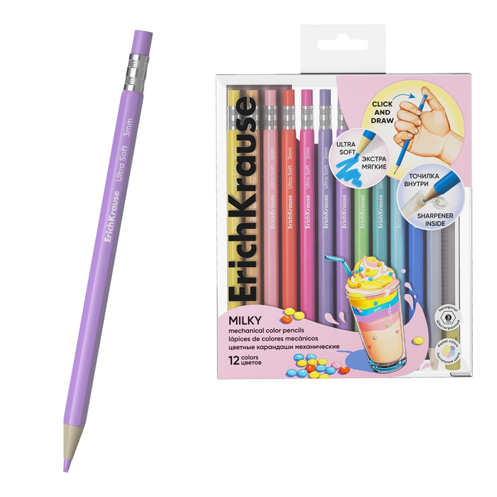 Цветные карандаши механические ErichKrause Пастель Сливки шестигранные, грифель 3 мм, 12 цветов с то