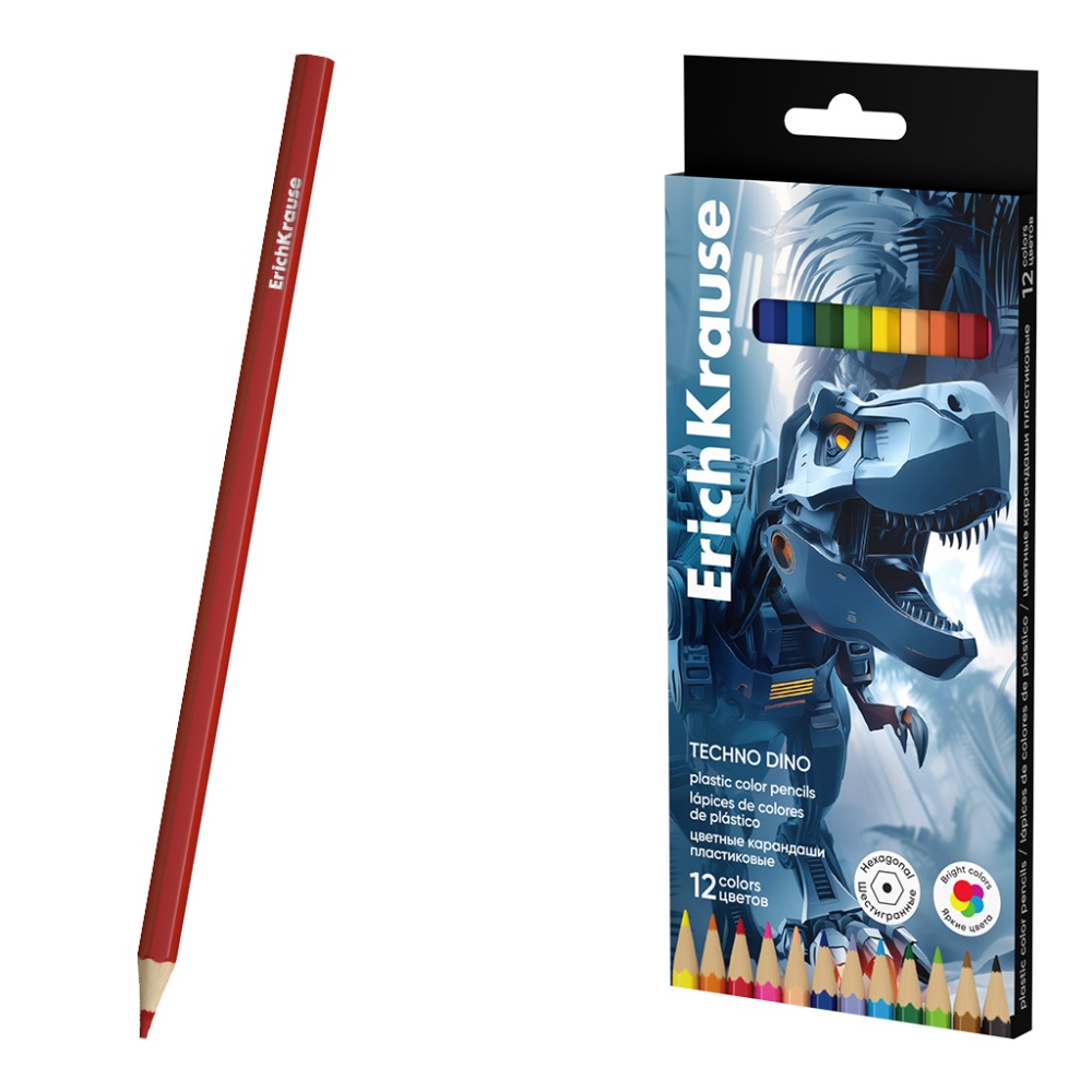 Цветные карандаши пластиковые ErichKrause Техно Дино шестигранные 12 цветов (в коробке с европодвесо