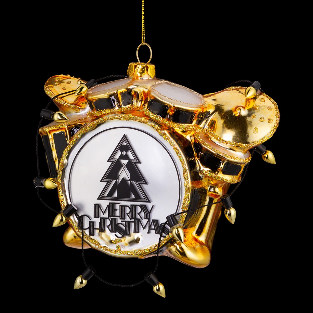 Сочетание черного и золотого цветов в дизайне интерьера считается верхом элегантности. Такая комбинация создает роскошный образ, который подойдет для праздничной вечеринки. Потрясающая барабанная установка порадует любителей музыки. На лицевой стороне барабана напечатана надпись MERRY CHRISTMAS (англ. "С Рождеством"). Крупное объемное украшение декорировано новогодней гирляндой. Изделие выполнено из стекла высокого качества. Групповая упаковка предназначена только для безопасной транспортировки и хранения.