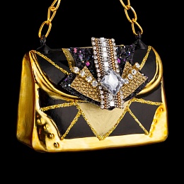 Сочетание черного и золотого цветов в дизайне интерьера считается верхом элегантности. Такая комбинация создает роскошный образ, который подойдет для праздничной вечеринки. Клатч - маленькая сумочка-конверт, элемент вечернего гардероба дамы. Украшение выполнено из стекла высокого качества и оснащено цепочкой для подвешивания. Кожаные вставки, крупные камни и стразы добавляют образу эксклюзивность. На дне изделия есть технологическое отверстие, связанное с процессом производства, при котором стеклянная игрушка выдувалась вручную.
