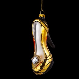 Сочетание черного и золотого цветов в дизайне интерьера считается верхом элегантности. Такая комбинация создает роскошный образ, который подойдет для праздничной вечеринки. Каблук и платформа золотой туфельки декорированы плотным слоем черных блесток. Носок украшен крупным камнем. Изделие выполнено из стекла высокого качества. Групповая упаковка предназначена только для безопасной транспортировки и хранения.