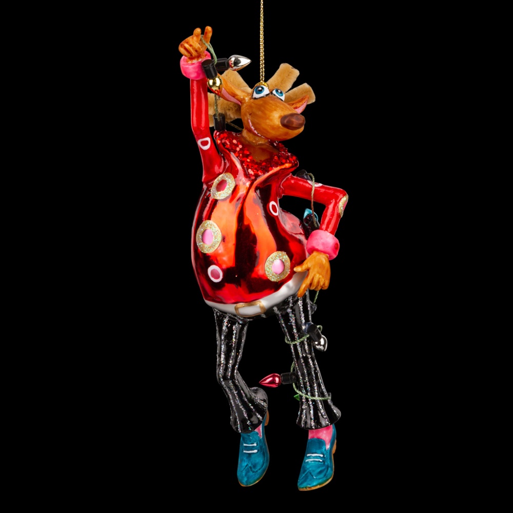 Очаровательный Лось с пушистыми рожками устроит настоящую дискотеку на праздничной елке. Особое внимание уделено костюму персонажа - ярко-красная рубашка гармонирует с полосатыми брюками клеш и остроносыми туфлями. В руках Лосяш держит гирлянду с разноцветными лампочками. Изделие выполнено из стекла высокого качества. Голова, руки и ноги сделаны из полирезины, что позволяет максимально точно передать детализацию. Крупный размер предполагает использование украшения на больших елях. Групповая упаковка предназначена только для безопасной транспортировки и хранения.