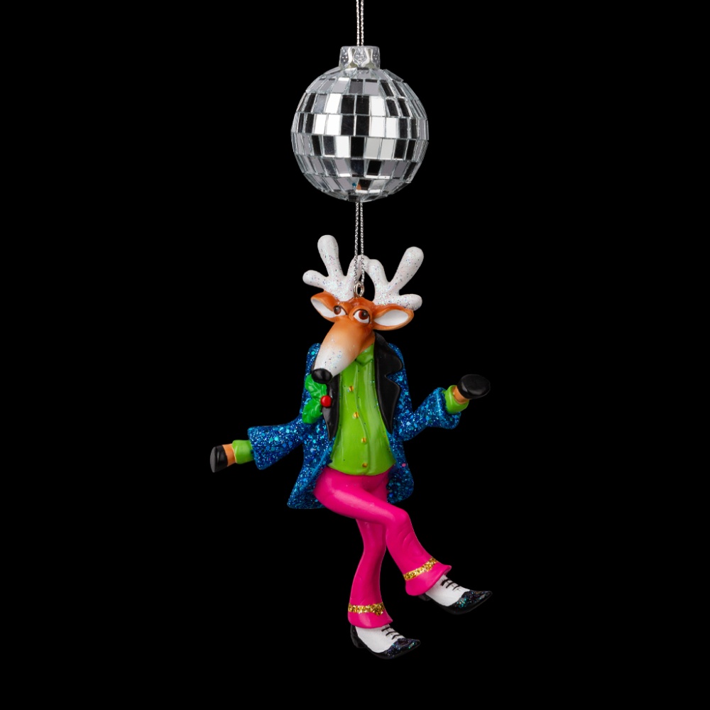 Зажигательный олень танцует на ветвях елки, создавая вокруг атмосферу праздника. Яркий костюм подчеркнут искристыми блестками. Сверкающий диско-шар над головой персонажа станет центром внимания в праздничном оформлении. Изделие достаточно тяжелое и больше подходит для искусственных елок. Размер указан от самой высокой точки диско-шара. Групповая упаковка предназначена только для безопасной транспортировки и хранения.
