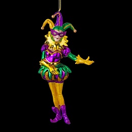 Яркие веселые персонажи Венецианского карнавала на праздничной елке вовлекут в вихрь итальянского веселья. Коломбина - возлюбленная Труфальдино, персонаж итальянского народного театра Комедия дель Арте. Красота и весёлый нрав делают её привлекательной для мужчин. Наряд восхищает яркими сверкающими красками, которые создают настроение праздника. Туловище выполнено из стекла высокого качества. Голова, руки и ноги сделаны из полирезины, что позволяет максимально точно передать детализацию персонажа. Групповая упаковка предназначена только для безопасной транспортировки и хранения.
