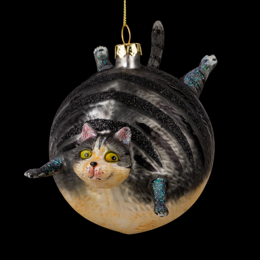 Уникальная елочная игрушка, аналог которой сложно найти - отличный презент к Новому году. Это не просто шар - это веселый, объемный, и со всех сторон очаровательный персонаж. Кот с забавной мордочкой имеет натуралистичный окрас. Сверкающее покрытие и декор из блесток добавляют атмосферу праздника. Изделие выполнено из стекла высокого качества. Голова и лапы сделаны из полирезины, что позволяет максимально точно передать детализацию. Групповая упаковка предназначена только для безопасной транспортировки и хранения.