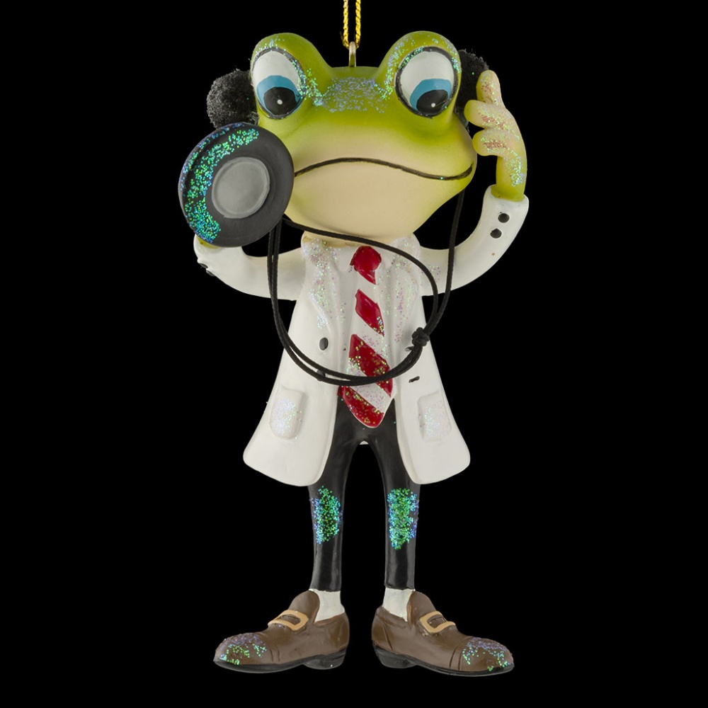 Лягушонок одет в костюм врача и держит в лапках стетоскоп с пушистыми наушниками. Под белым халатом персонаж носит строгий галстук, что подчеркивает уровень профессионализма доктора. Отличный подарок для медицинских работников. Украшение восхищает тонко прорисованными деталями. Изделие достаточно тяжелое и больше подходит для искусственных елок. Групповая упаковка предназначена только для безопасной транспортировки и хранения.