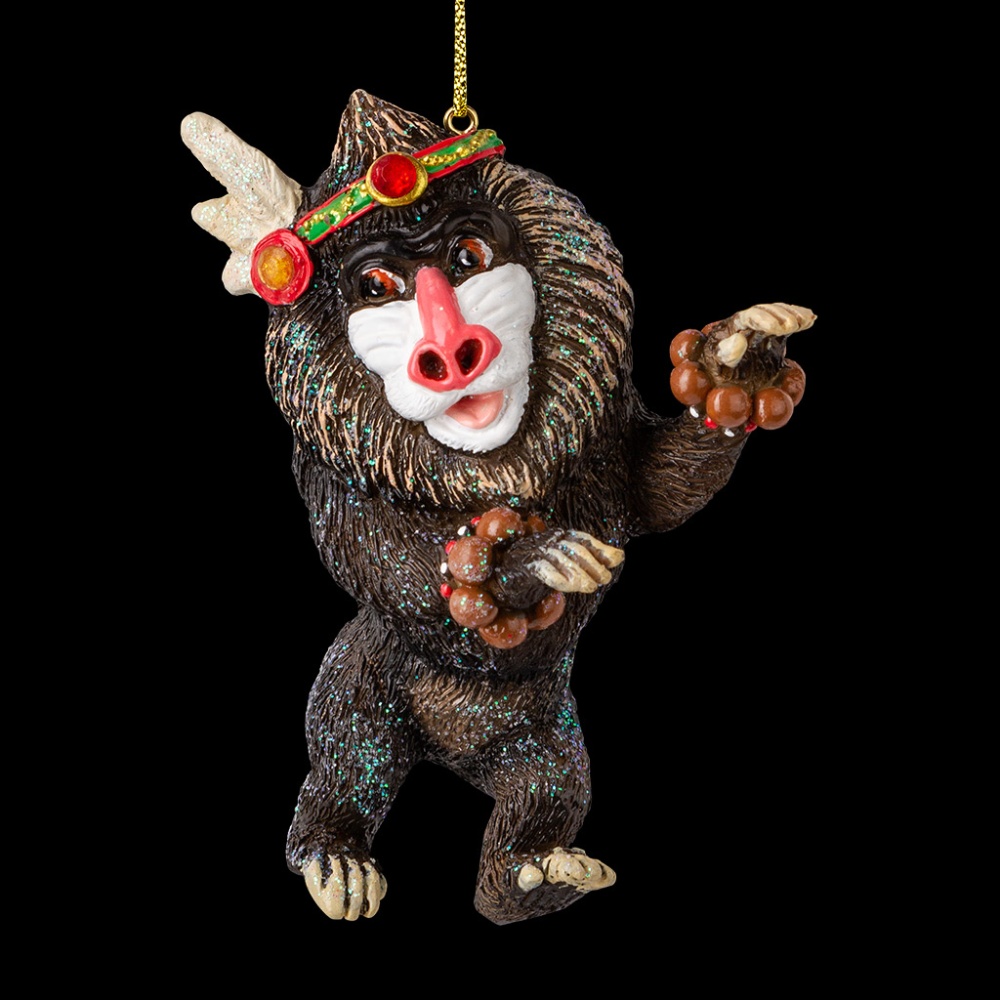 Орангутан удивляет необычным костюмом индейца. На лапах красуются крупные браслеты, повязка на голове декорирована рубиновым камнем. Детали тщательно прорисованы, тело покрыто мелкими, едва заметными блестками. Оринальное украшение будет ярко смотреться на елке, добавляя дух праздника в новогодний декор. Изделие является относительно тяжелым, предпочтительно использование на искусственной елке. Групповая упаковка предназначена только для безопасной транспортировки и хранения.