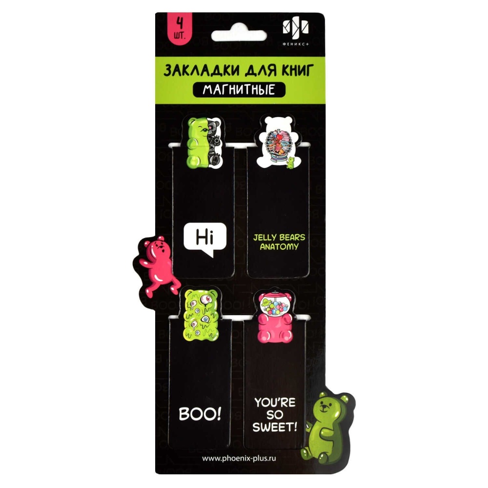 Набор закладок магнитных для книг, ЖЕЛЕЙНЫЕ МИШКИ. Размер: 30x60 мм. Комплектность: 4 шт. в наборе. Материал: мелованная бумага, ферроагломерированный полимер. Цвет - зелёный, розовый, чёрный. Отделка: полноцветный дизайн, фигурная вырубка. Особенности: глянцевая ламинация. подложка с европодвесом из мелованного картона + ПЭТ-пакет.