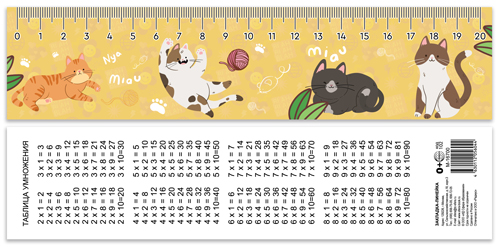 Закладка-линейка от ТЦ Сферы не оставит равнодушным ни одного школьника, который души не чаят в пушистых любимцах. Уверяем, с ней ребенку будет не скучно выполнять школьные или домашние задания. На задней стороне напечатана таблица умножения, из-за чего линейка может быть использована в качестве карточки-шпаргалки.