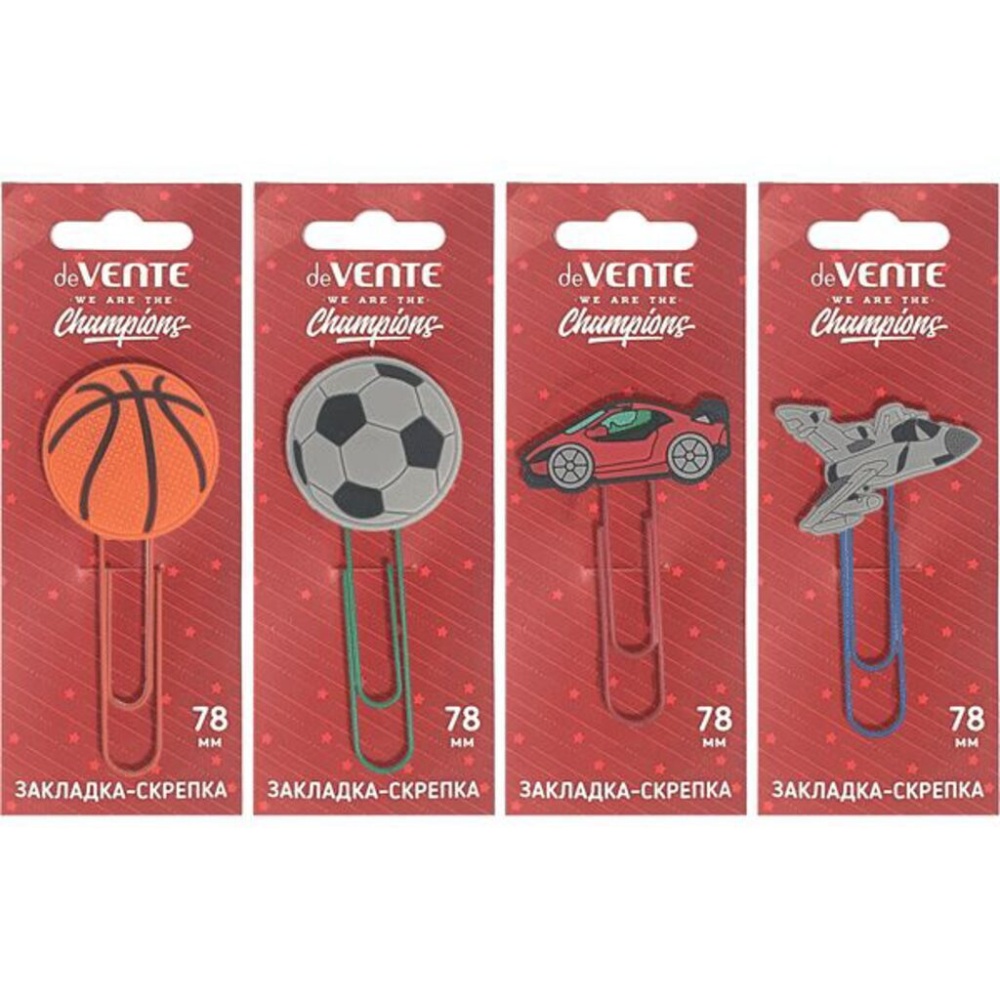 Закладка-скрепка "deVENTE. Champions" металлическая овальная цветная 78 мм с элементами декора, в блистерной упаковке, ассорти 4 дизайна
