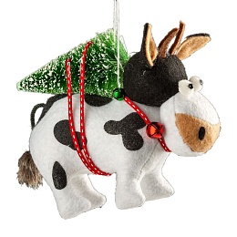 Пятнистая буренка выполнена из текстиля. На спине красуется большая елка, прикрепленная с помощью ленточки, декорированной звенящими бубенчиками. Можно использовать в качестве елочного украшения или в качестве игрушки. Техническая упаковка - полибэг, только для безопасной транспортировки и хранения.