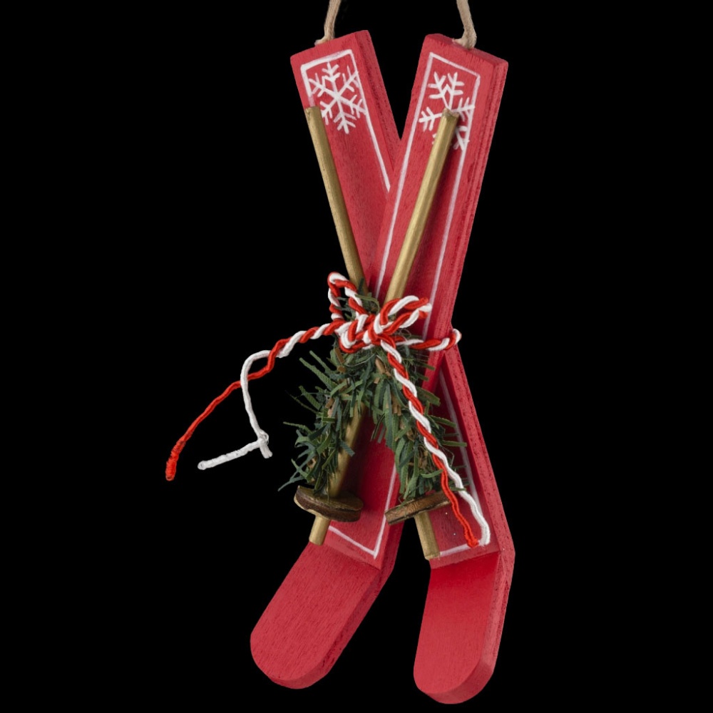 Украшения из древесины - тренд в области праздничного декора. Легкие и безопасные в использовании, на елке они смотрятся очень необычно. Отличный вариант для семьи с маленьким ребенком, а также детских учреждений. Изящные лыжи красного цвета дополнены металлическими лыжными палками. Изделие декорировано шелковой ленточкой и сосновой веточкой. Групповая упаковка предназначена только для безопасной транспортировки и хранения.