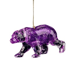 Медведь выполнен в хрустально-прозрачном цвете с фиолетовым отливом. Блестки запечатаны внутри изделия, за счет этого внешняя поверхность остается гладкой и приятной на ощупь. При дневном свете игрушка создаёт впечатление ледяной фигуры, а ночью украшение загадочно переливается и бликует от огоньков праздничных гирлянд. Техническая упаковка - полиэтиленовый пакет, только для безопасной транспортировки и хранения.